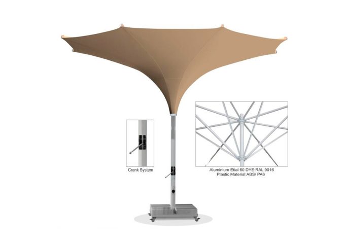 Bahçenizde, havuz kenarında kullanabileceğiniz 8 kollu, alüminyumdan üretilmiş yuvarlak şeklinde şemsiyedir. Beyaz renkli elektrostatik boya (RAL 9010) ile kaplanarak üretilen şemsiyenizin orta borusu 50 mm’dir. İskelette bulunan plastik parçalar, tüm dünyada şemsiye üretiminde kullanılan kırılmaya karşı 2 yıl garantili, ABS ve POLYAMID PA6 PRIME hammadde kullanılarak üretilmiştir. Şemsiyenizin rüzgar tahliyesi tepe kısmında bulunan hava pencereleri ile yapılabildiği için şemsiyenizi rüzgarlı havalarda güvenle kullanabilirsiniz.